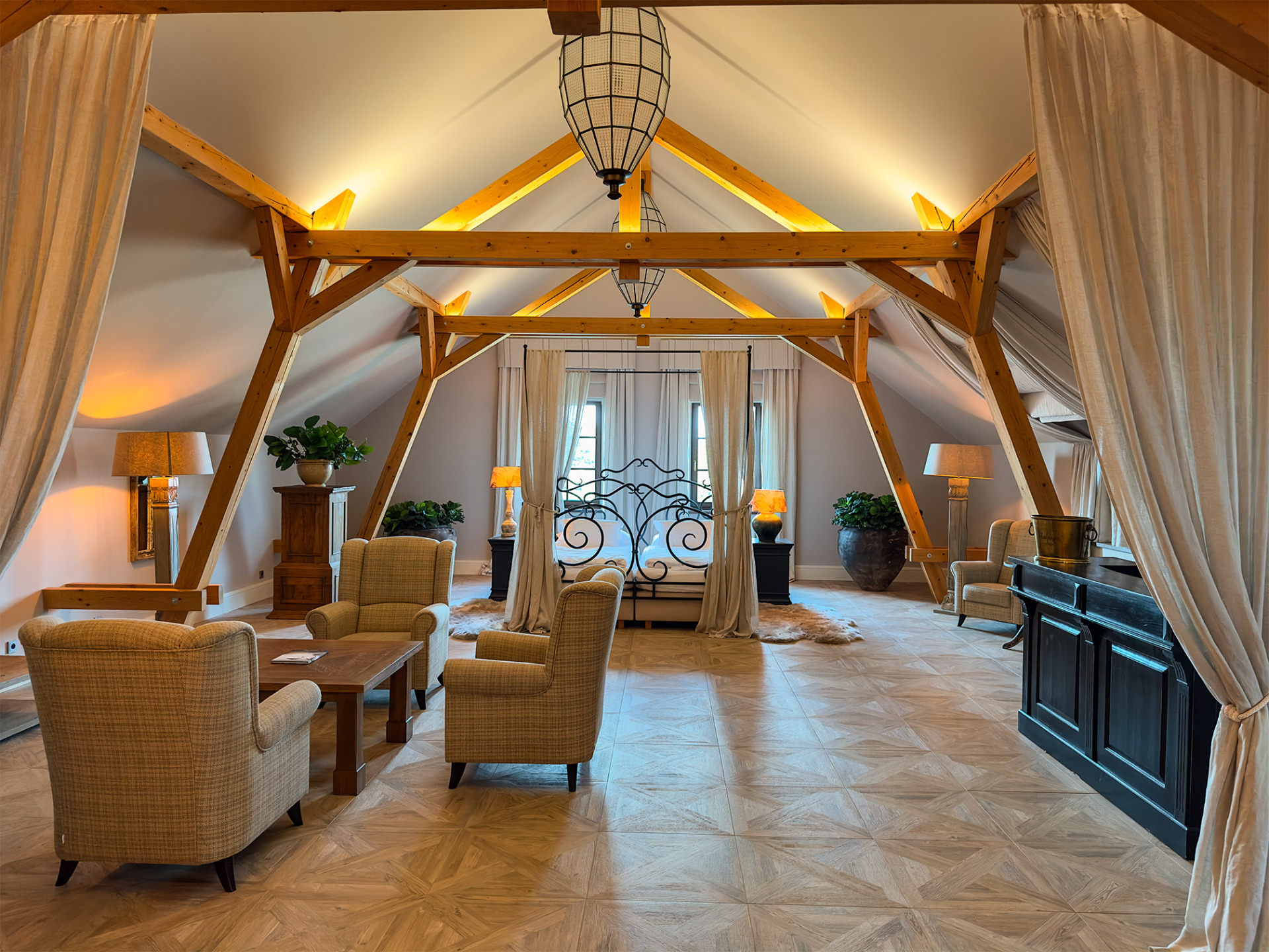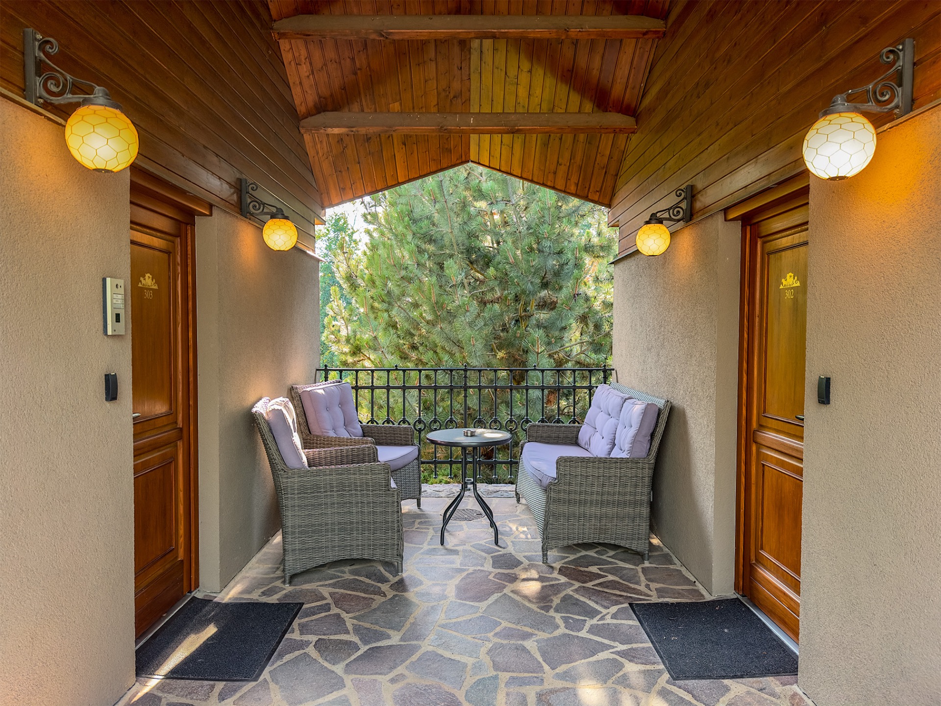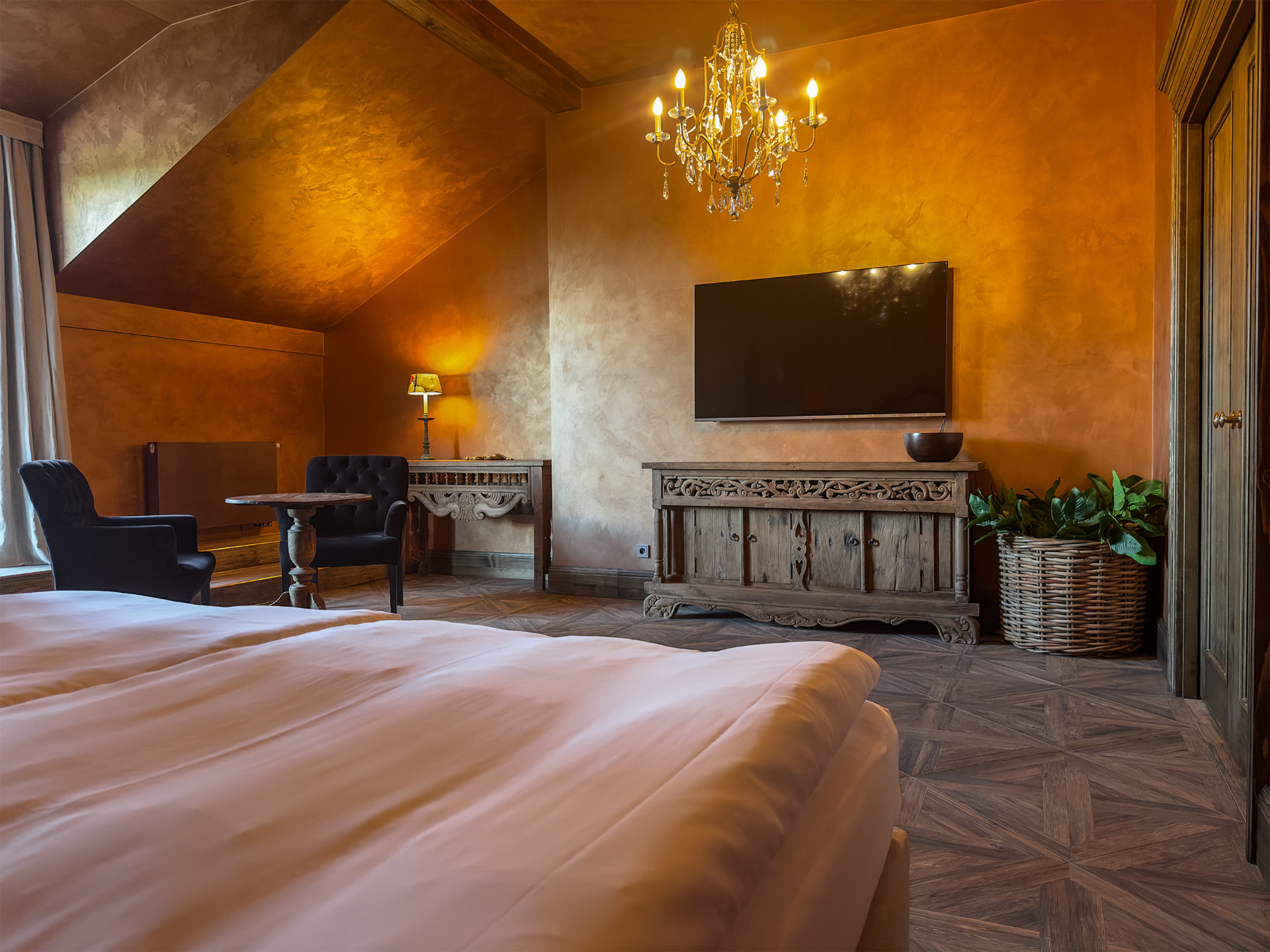 Not only for lovers, there are two double rooms equipped with a bathtub and a four-poster bed. The windows of the rooms face south and north, with the south side overlooking the beautiful lake and the hotel garden.